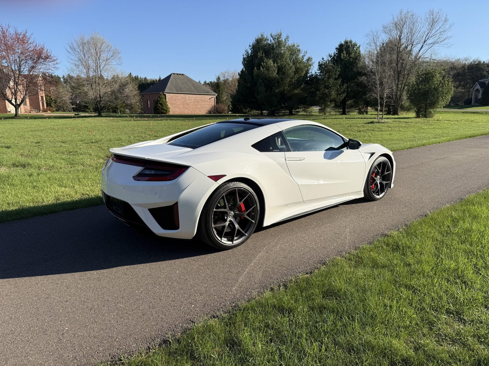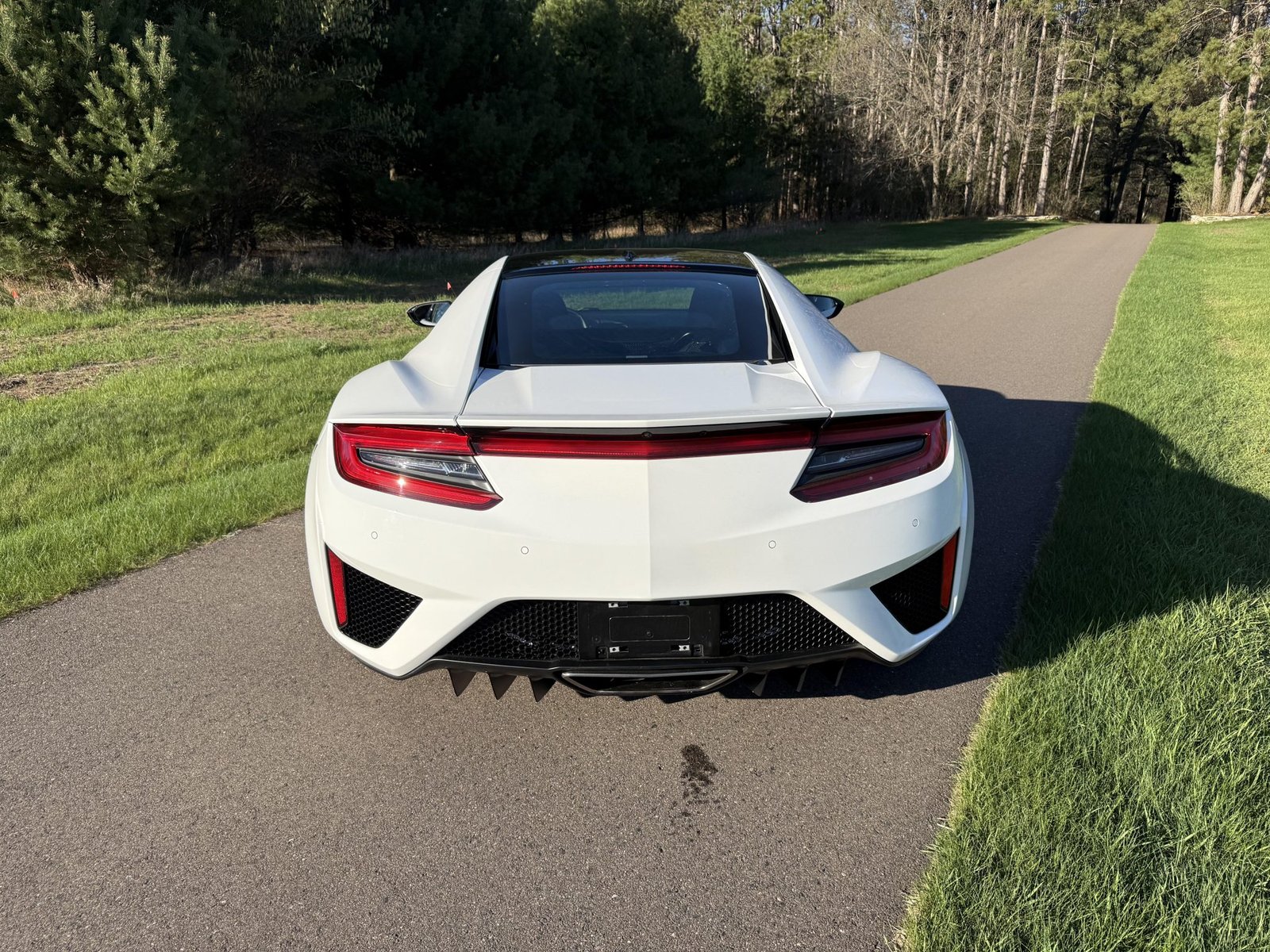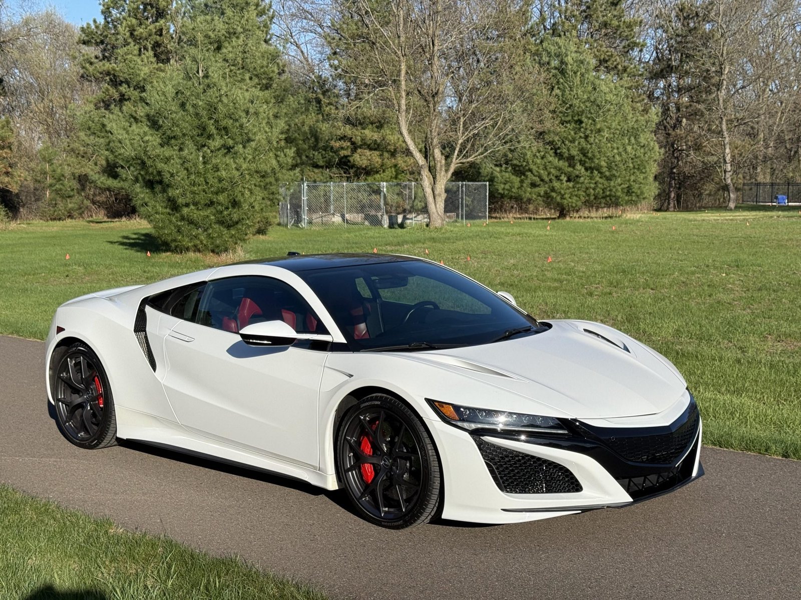 Finished in 130R White over red and black leather/Alcantara upholstery, the 2017 Acura NSX is a modern hybrid supercar that blends advanced electrification with traditional driving exhilaration. Its sculpted, aerodynamic body incorporates functional side air intakes, “Jewel Eye” LED headlights, pop-out door handles, and center-mounted exhaust outlets.