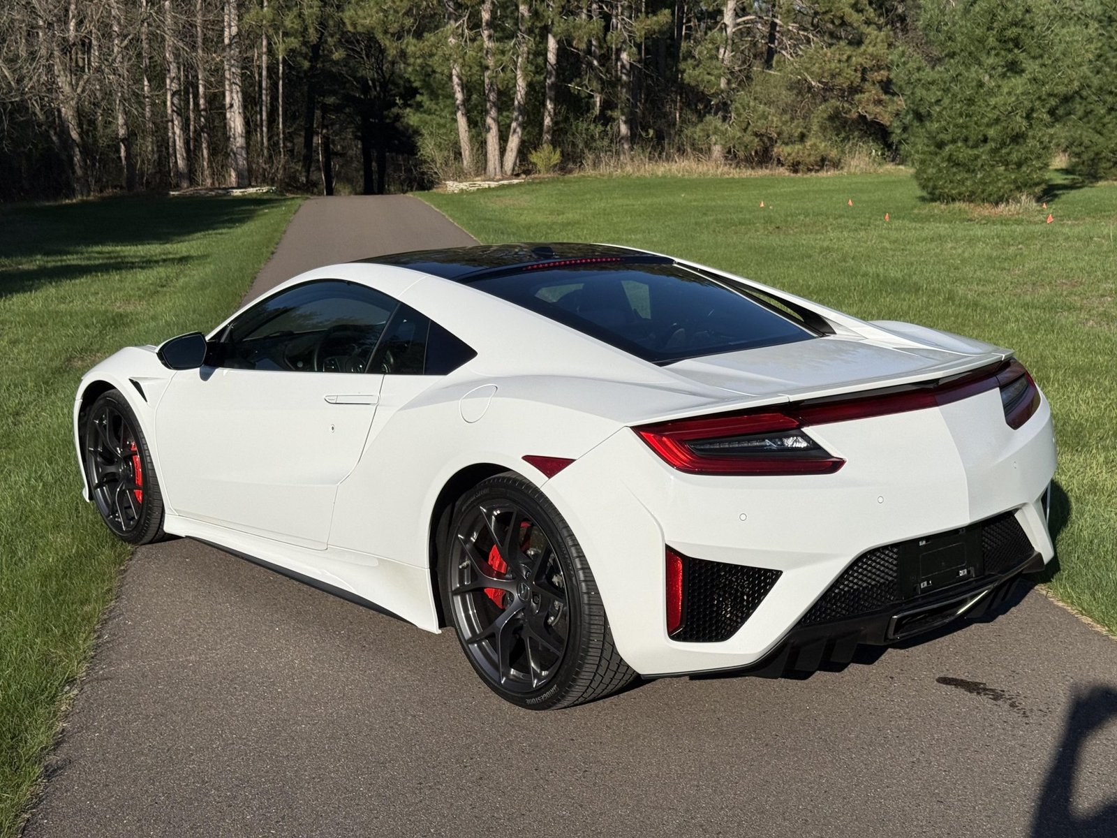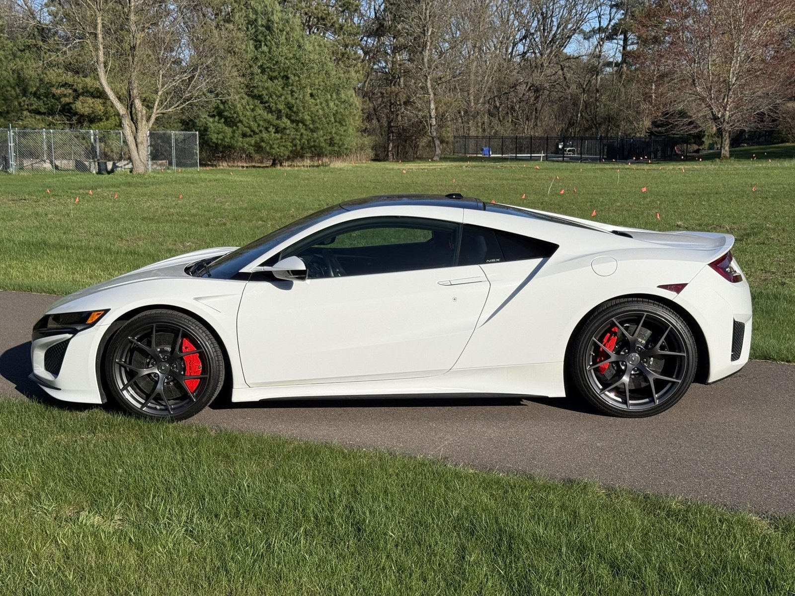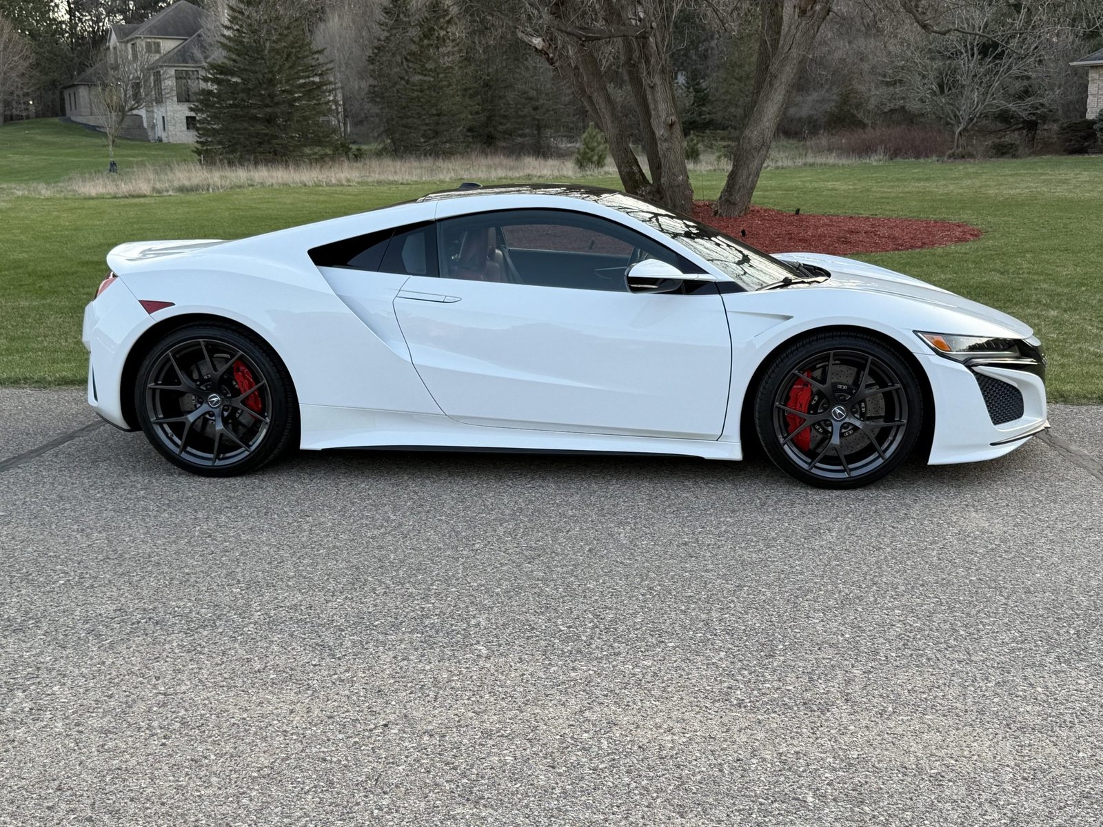 Finished in 130R White over red and black leather/Alcantara upholstery, the 2017 Acura NSX is a modern hybrid supercar that blends advanced electrification with traditional driving exhilaration. Its sculpted, aerodynamic body incorporates functional side air intakes, “Jewel Eye” LED headlights, pop-out door handles, and center-mounted exhaust outlets.