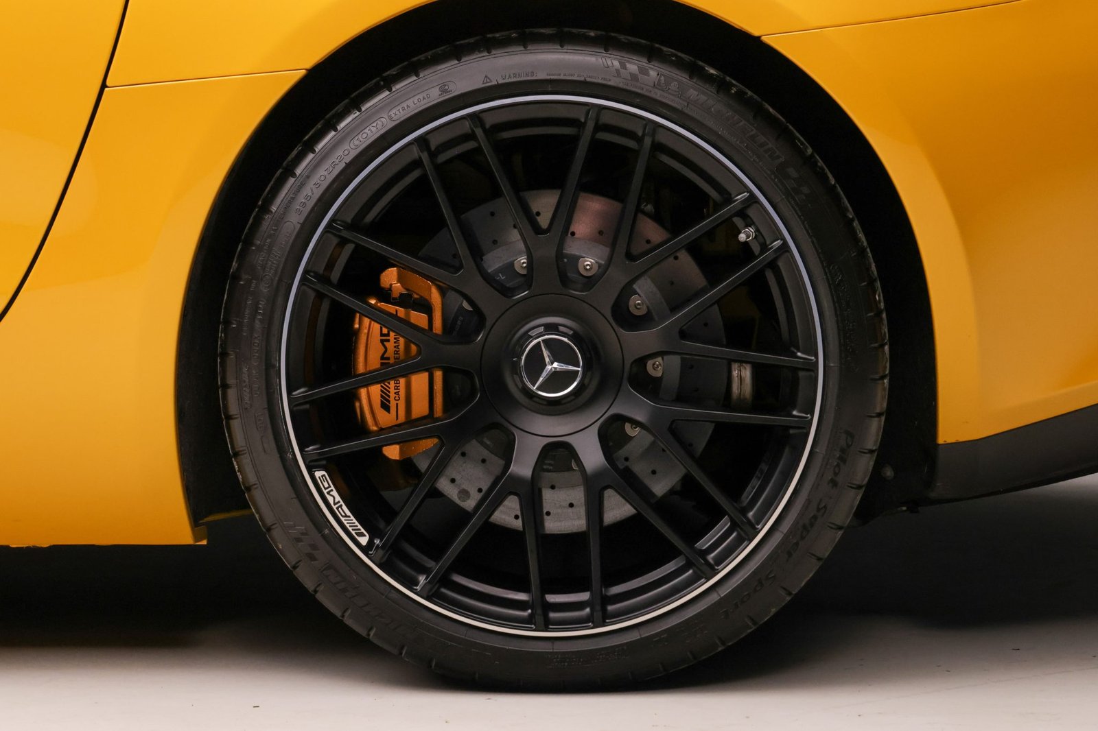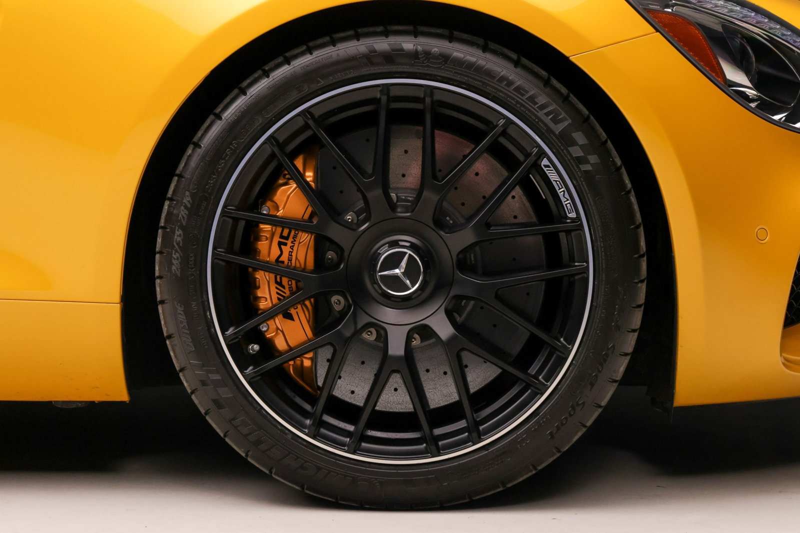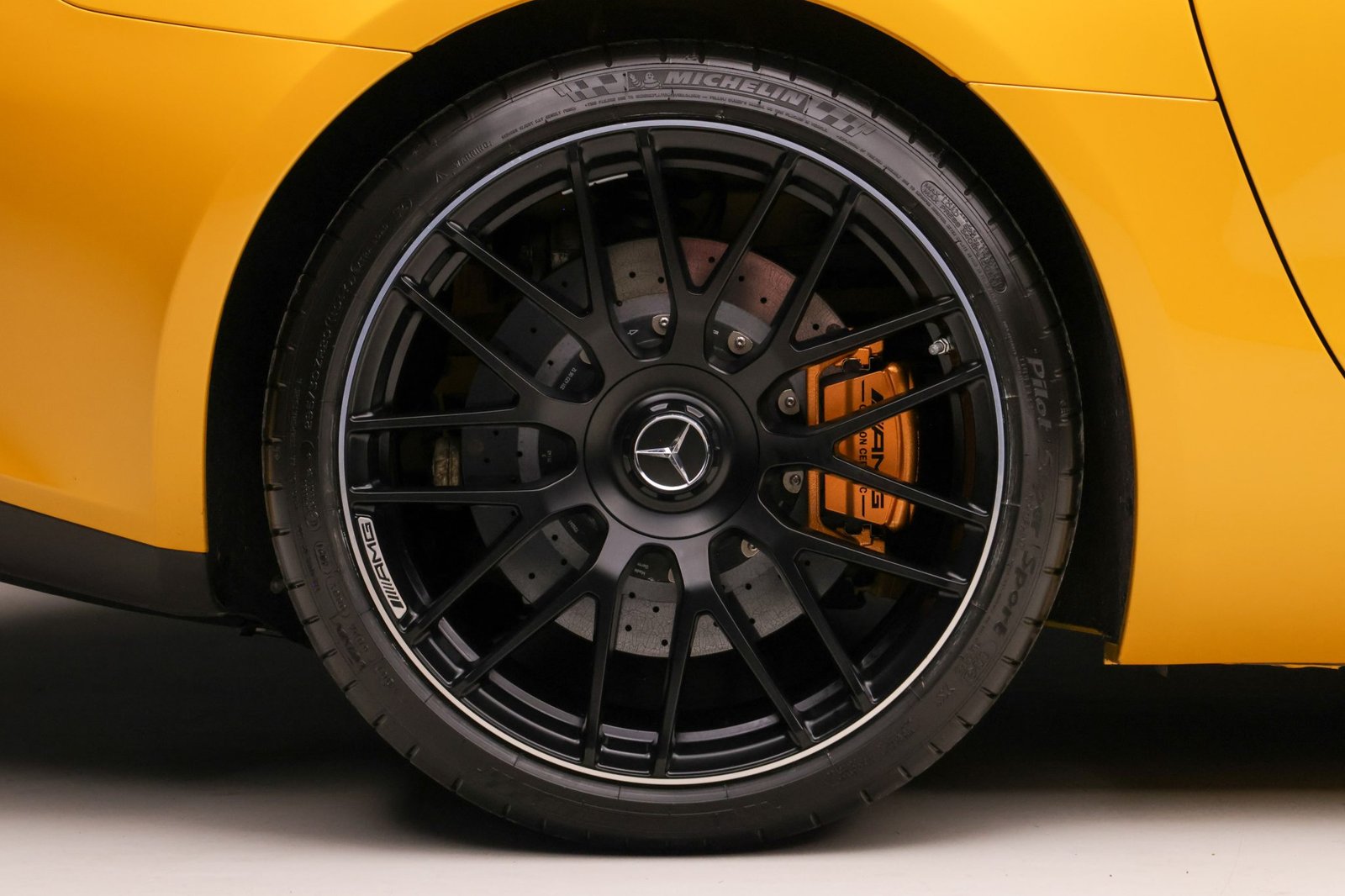 The 19″ and 20″ black AMG forged cross-spoke wheels are mounted with Michelin Pilot Super Sport tires. Optional ceramic-composite brakes with gold-painted calipers were an $8,950 option. The car came equipped from the factory with an AMG Adaptive Sport suspension, and the AMG Dynamic Plus Package added firmer damping, reprofiled steering, and increased negative front-wheel camber.
