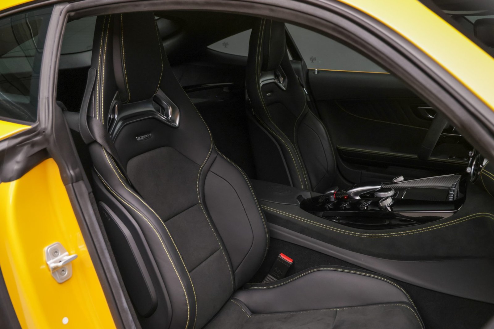 The heated power-adjustable AMG Performance seats are trimmed in Black Exclusive Nappa leather and Dinamica with contrasting Yellow stitching. Matching upholstery extends to the dashboard, center console, and door panels while the headliner is trimmed in Black Dinamica and matte carbon-fiber trim adorns the cabin. Further appointments comprise the $4,500 Burmester high-end sound system, a gloss carbon-fiber rear crossbar, a rearview camera, Lane Keeping Assist, dual-zone automatic climate control, and COMAND infotainment with navigation.