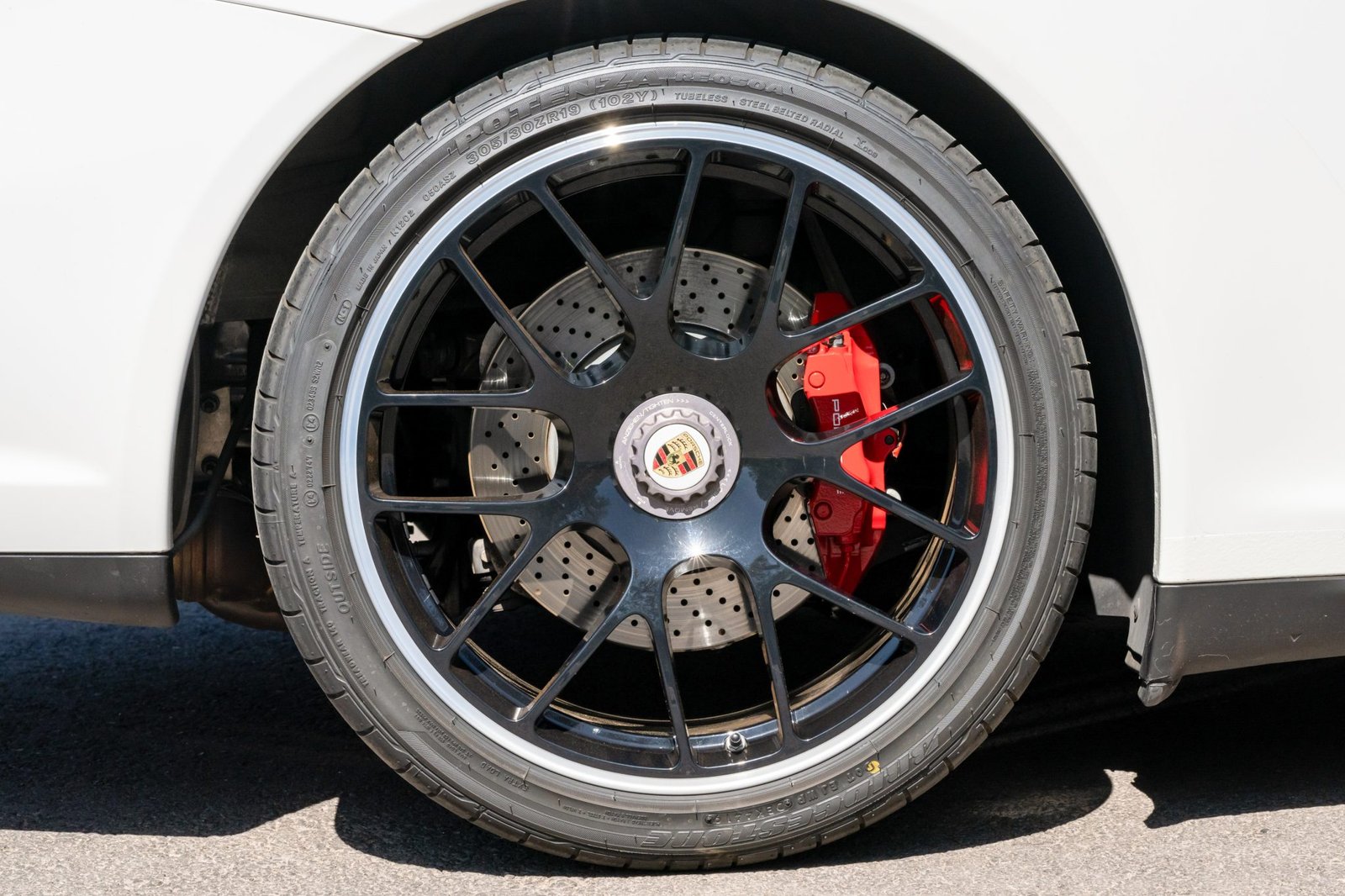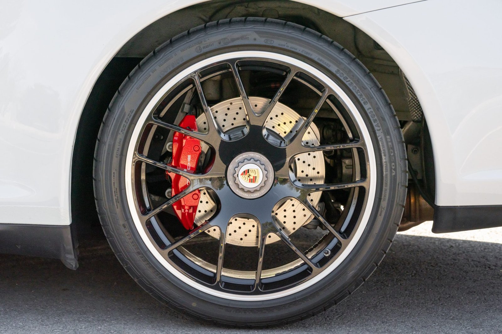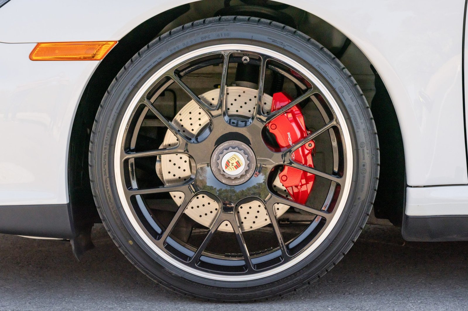 Finished in Carrara White, the Carrera GTS features a revised front apron with larger air intakes, black front lip spoiler, black side skirts, and a black rear diffuser. Additional highlights include bi-xenon headlights, LED taillights, quad exhaust outlets, a speed-activated rear spoiler, and a power sunroof. It rides on black 19' RS Spyder center-lock alloy wheels with Bridgestone tires and red Porsche-branded four-piston calipers over 13″ cross-drilled and vented rotors.