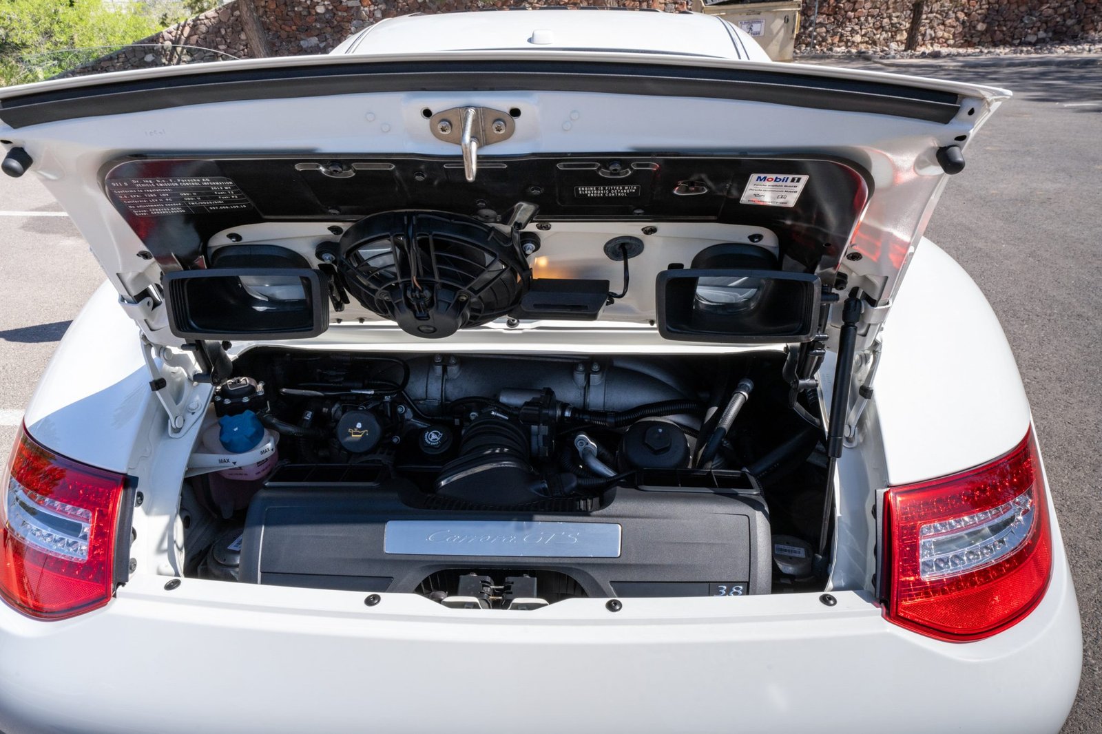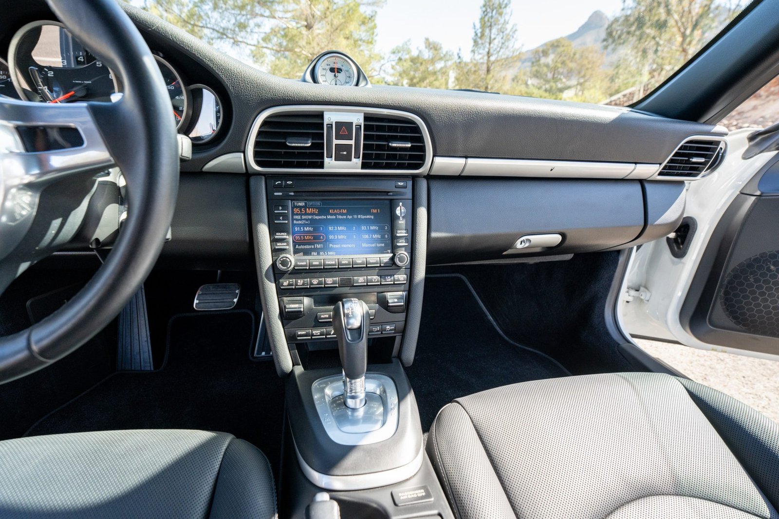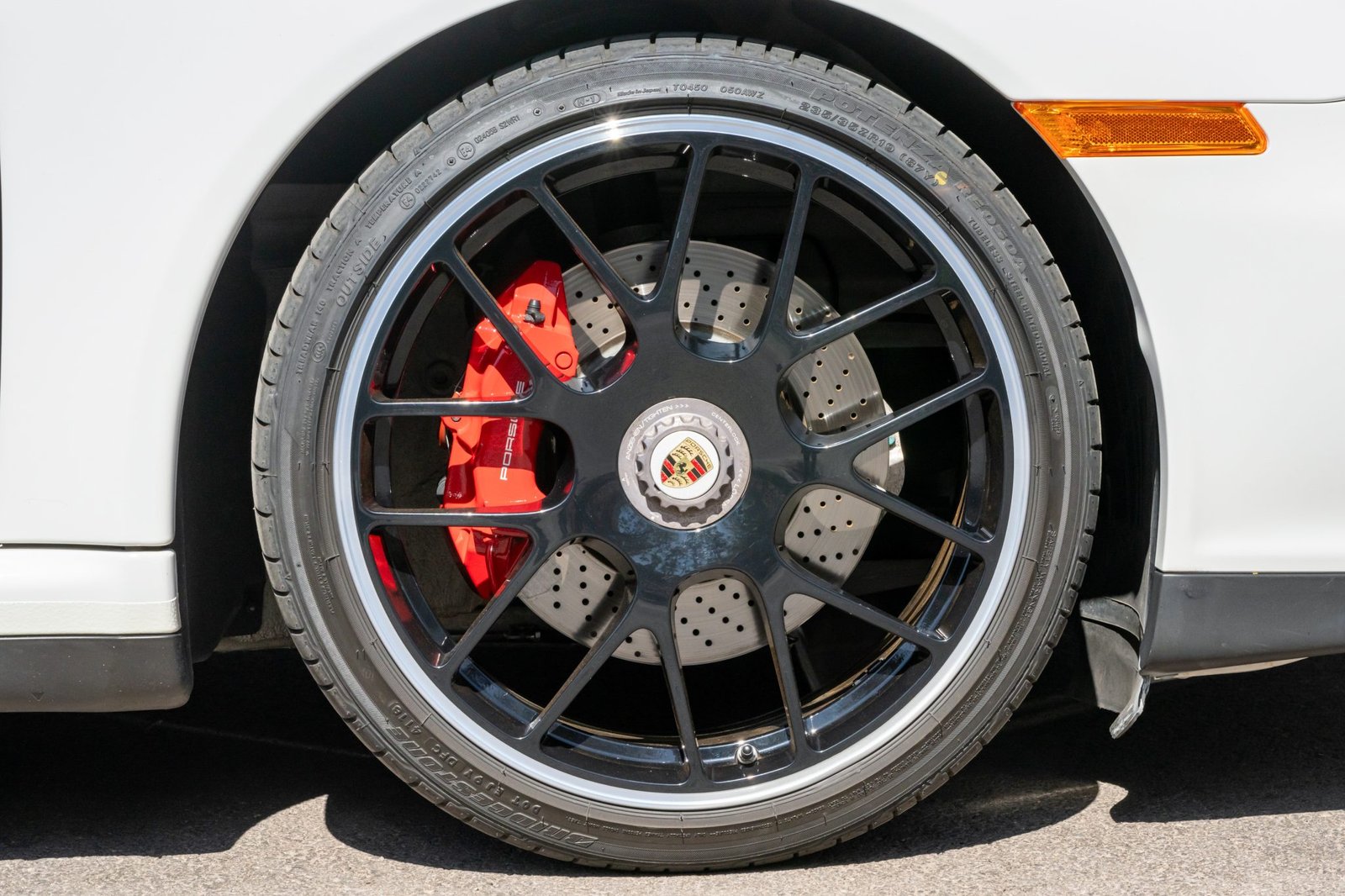 Finished in Carrara White, the Carrera GTS features a revised front apron with larger air intakes, black front lip spoiler, black side skirts, and a black rear diffuser. Additional highlights include bi-xenon headlights, LED taillights, quad exhaust outlets, a speed-activated rear spoiler, and a power sunroof. It rides on black 19' RS Spyder center-lock alloy wheels with Bridgestone tires and red Porsche-branded four-piston calipers over 13″ cross-drilled and vented rotors.