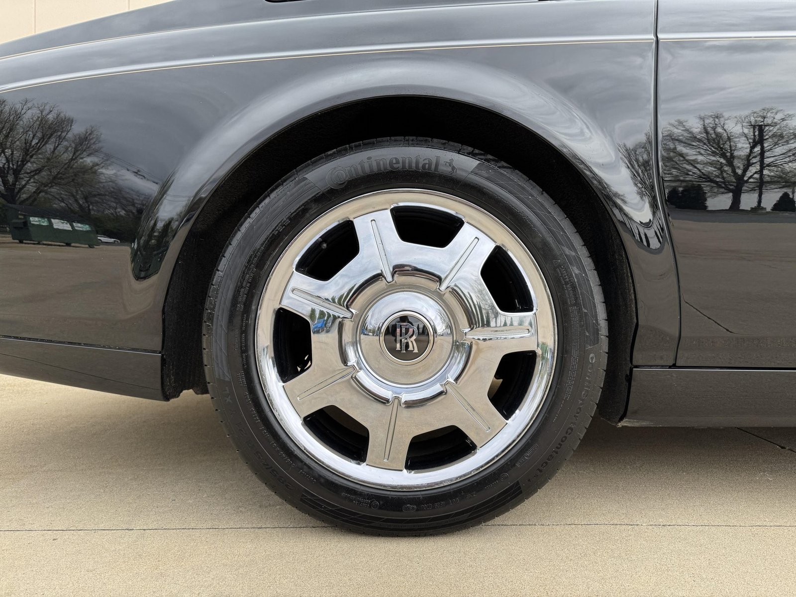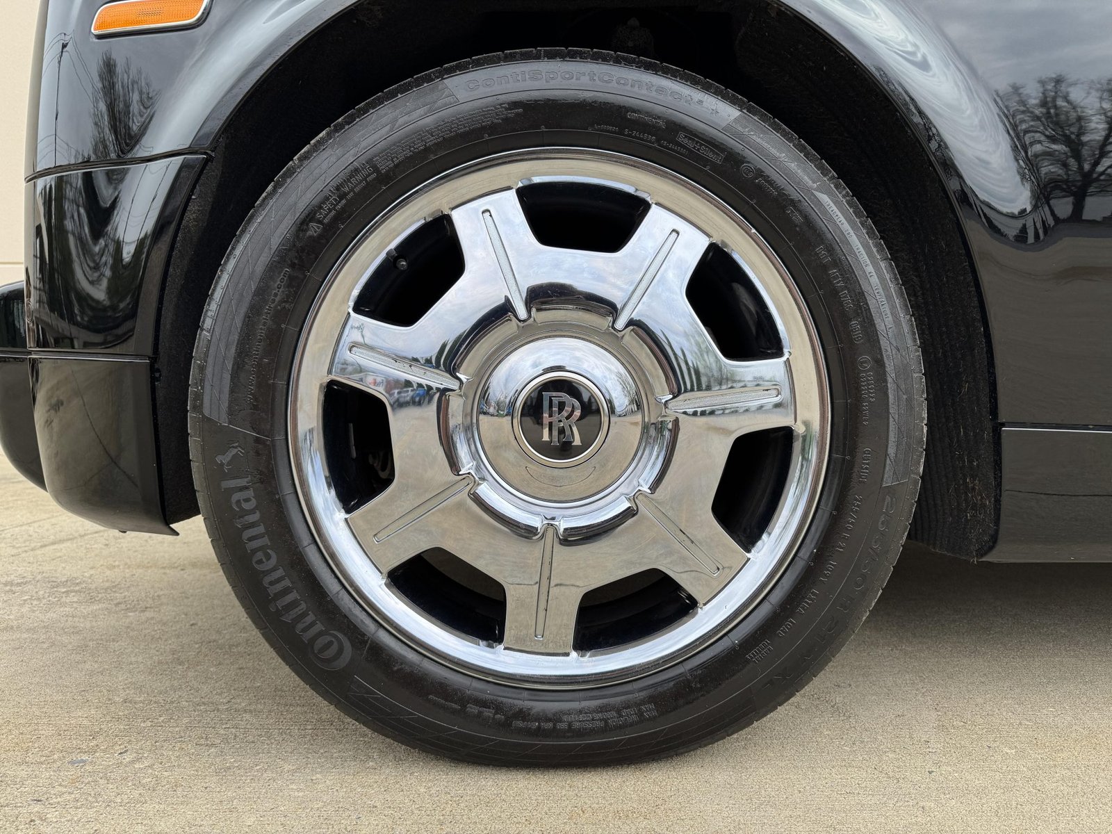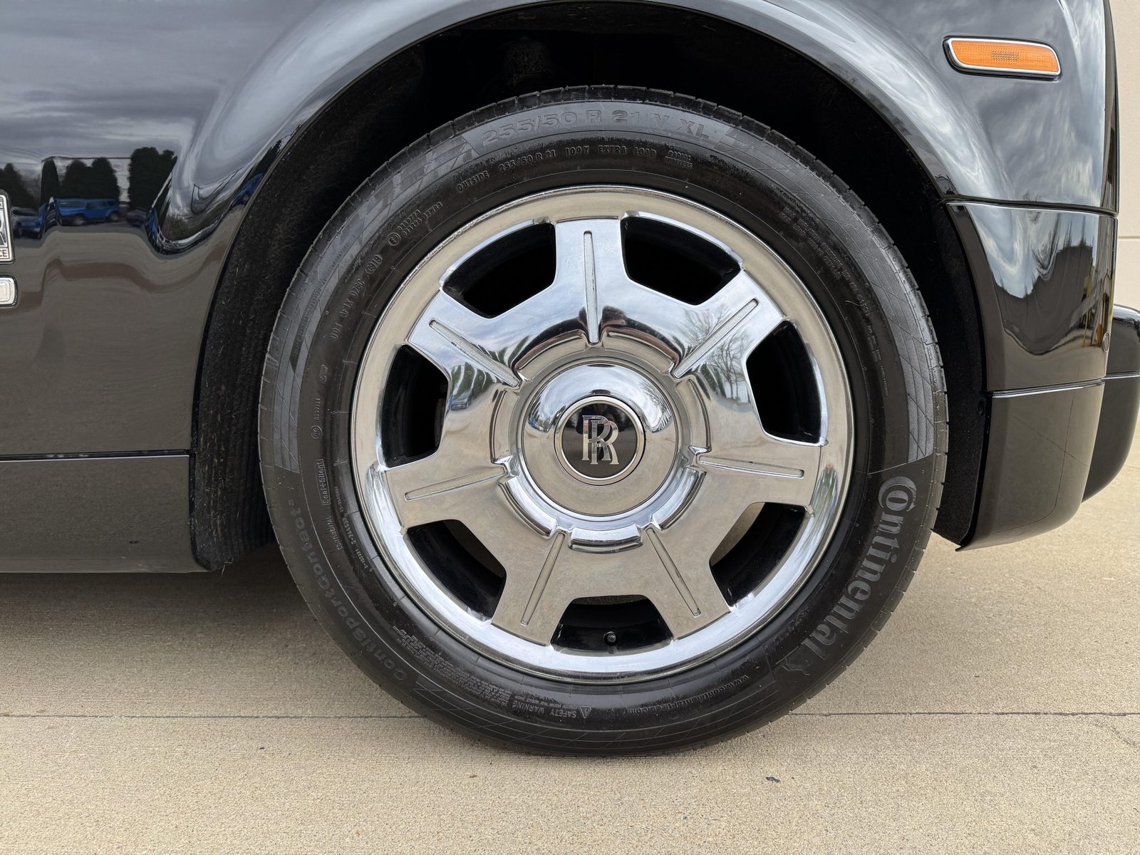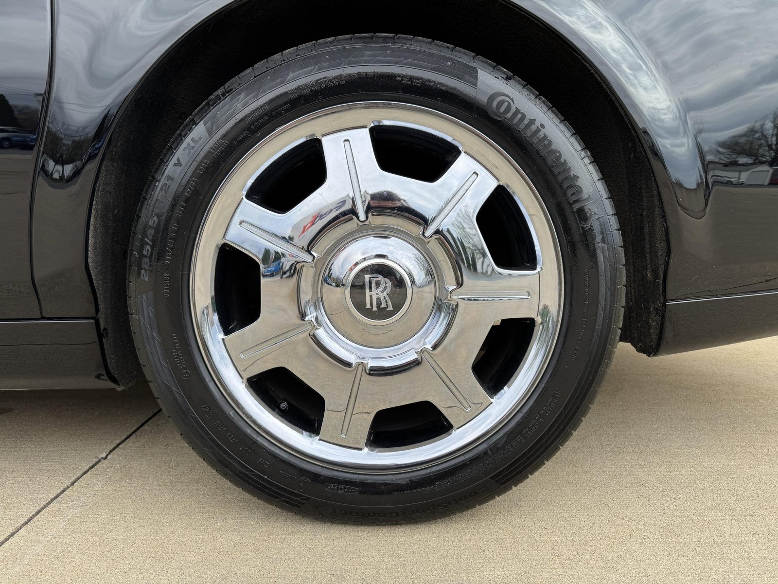 It rides on polished 21″ alloy wheels with self-righting Rolls-Royce center caps, wrapped in Continental ContiSportContact tires.