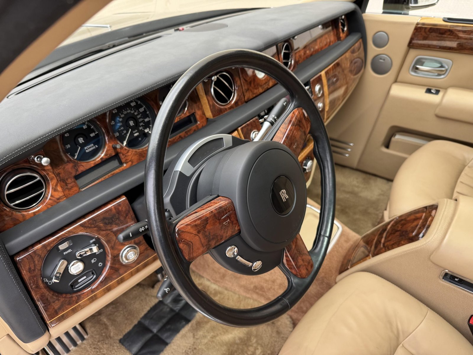 The leather-wrapped multifunction steering wheel features wood inlays and is mounted on a power-tilting column. Instrumentation includes a power reserve gauge, a 160-mph speedometer, and auxiliary readouts.